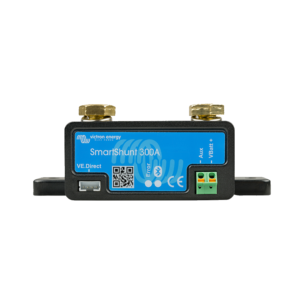 Victron SmartShunt 300A: Monitors battery voltage, current, and state-of-charge with Bluetooth and remote display compatibility.