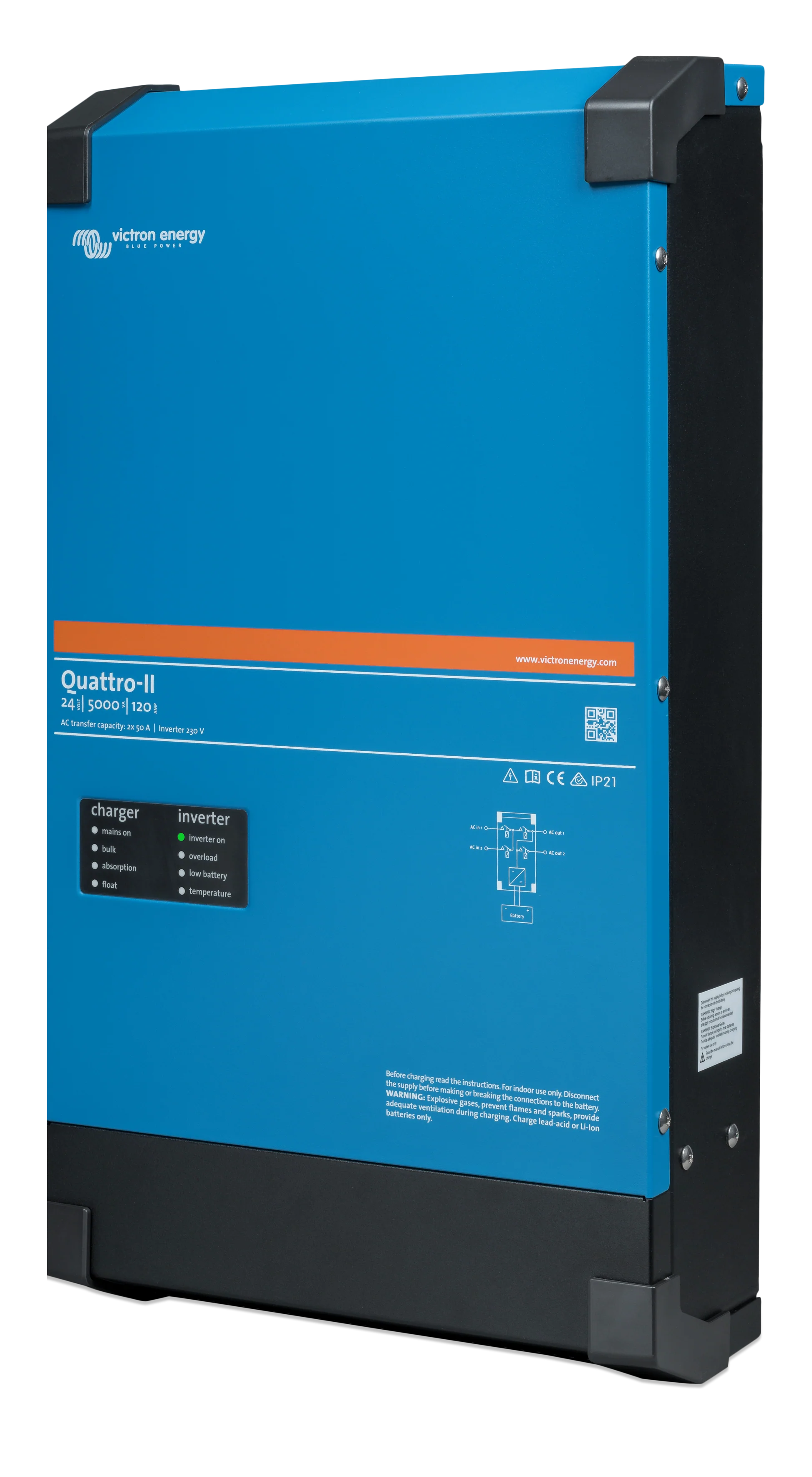 Each unit features robust inverter output, advanced power assist to prevent overload, and compatibility with Victron’s VRM Portal for remote system monitoring. Designed for performance, efficiency, and safety across all battery types, including lithium.