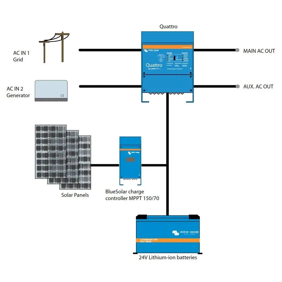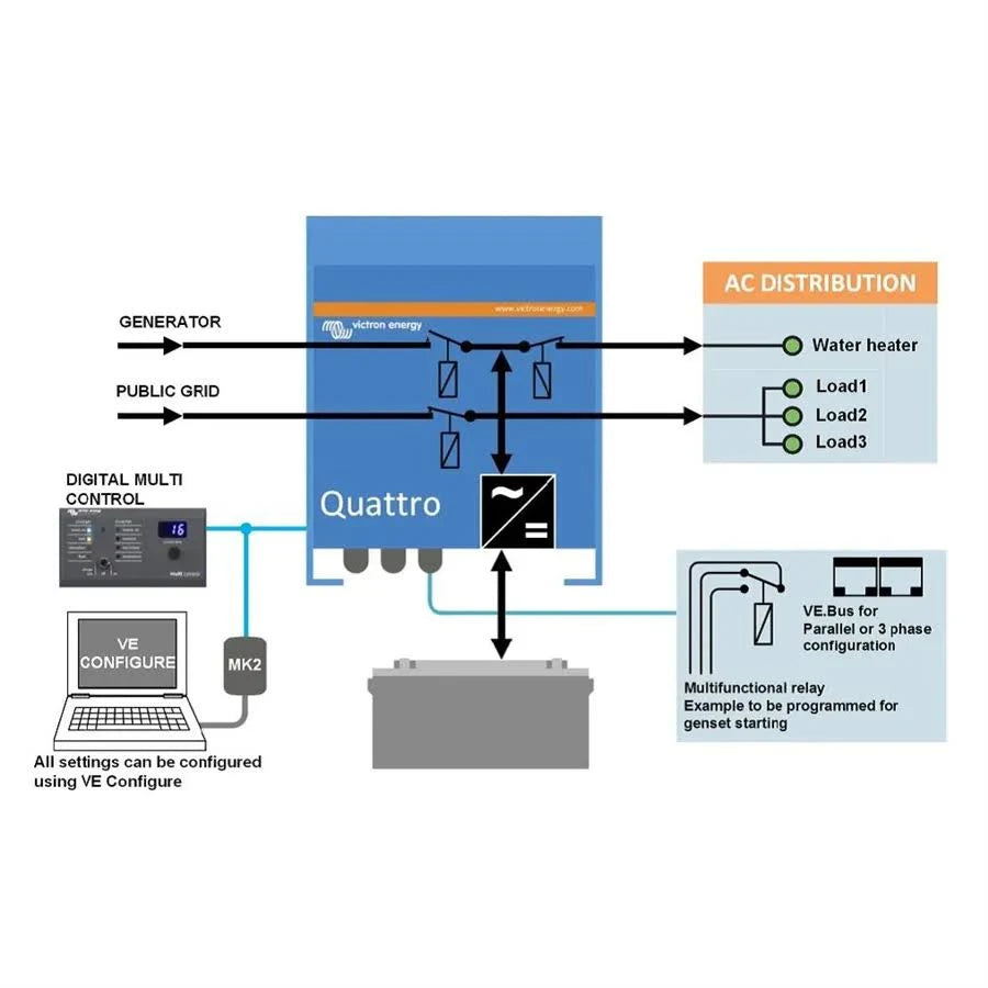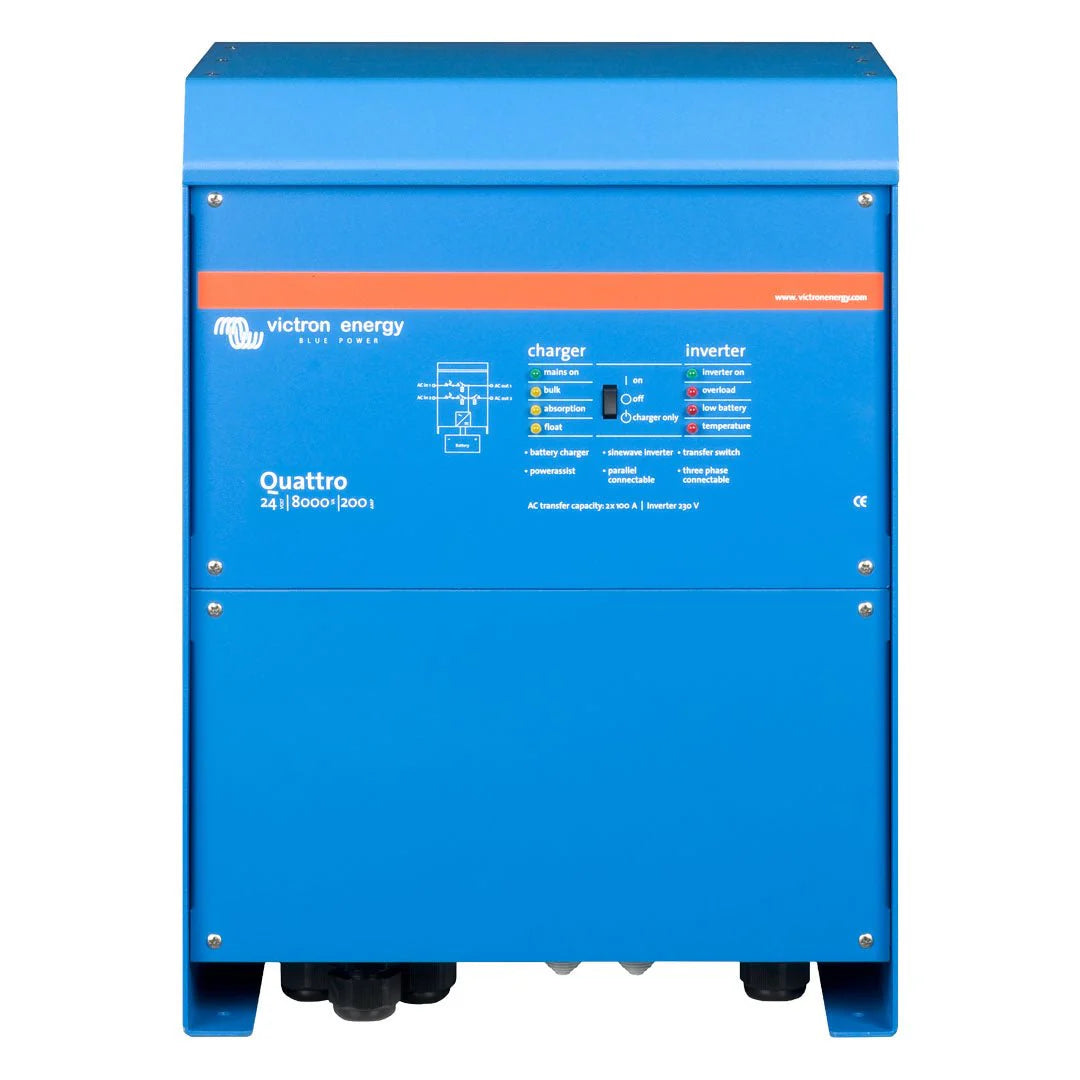Victron’s Quattro and Quattro-II series are premium inverter/chargers engineered for high-demand off-grid, marine, vehicle, and backup power applications. With dual AC inputs, seamless switching between power sources, and intelligent charging, these units ensure clean, reliable power anywhere. Models range from 3000VA to 5000VA, supporting 12V and 24V battery systems—ideal for everything from RVs to small off-grid homes.