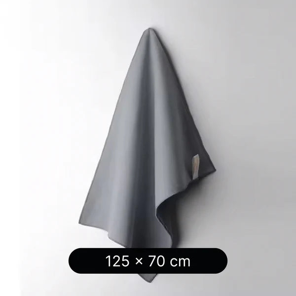 Gray towel hanging on a white wall with dimensions 125 x 70 cm displayed below.