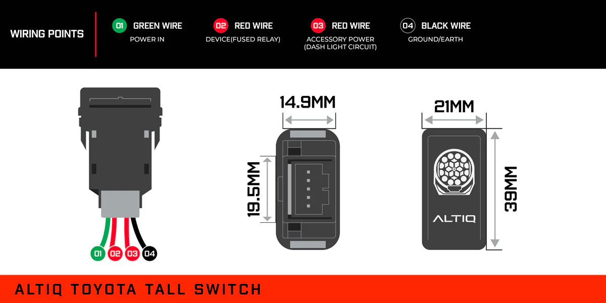 The ALTIQ™ Toyota Tall Push Button Switch is engineered to integrate seamlessly into your Toyota's factory dash, providing effortless control over your accessories.